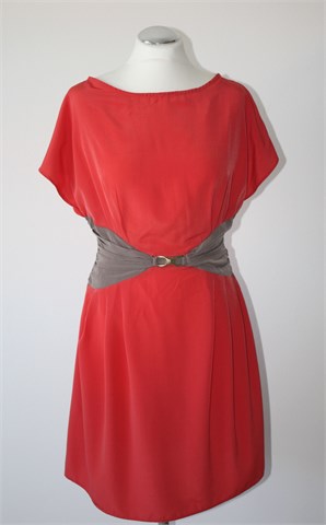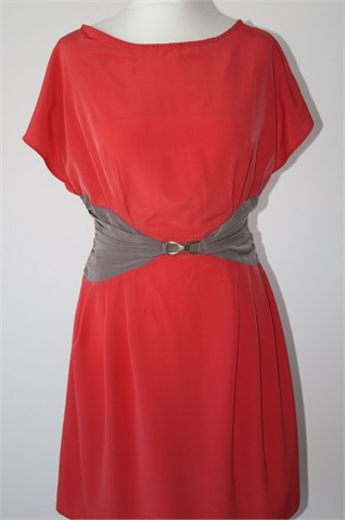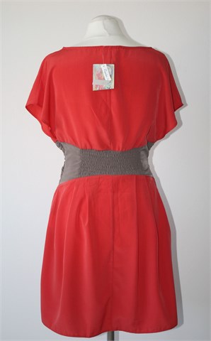 Collezione haljina sa kratkim rukavićima, neobične nijanse koraljne boje (oznaka boje na etiketi je teaberry), u struku detalji sive boje i imitacija remena (zlatna kopča). Bočni cif, sa stražnje strane ušivene su gumice (vidljivo na slici) pa je širina prilagodljiva. Tanak i lagan materijal.