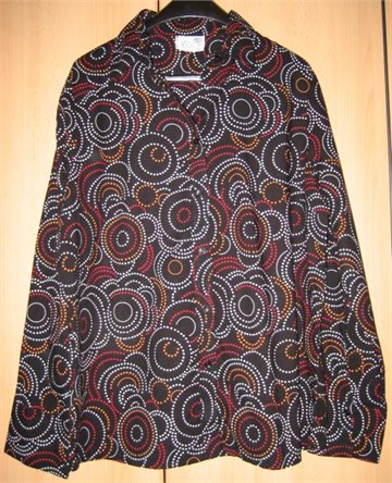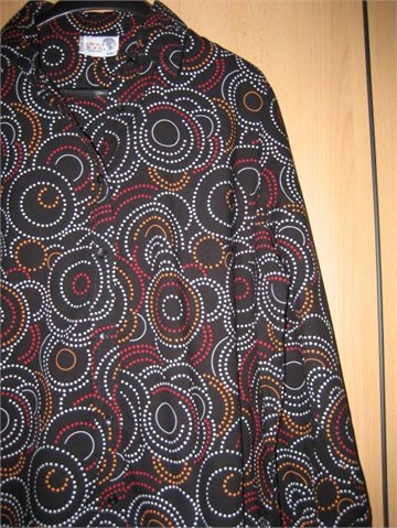 Košulja dugih rukava. Veličina piše XXL ali mislim da je manja. Crne boje sa šarenim printom u obliku krugova. Vrlo lagani pamuk. Nije rastezljiva. Ima ušitke.