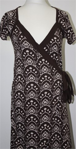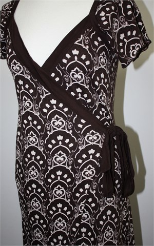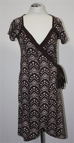 Colours of the world haljina tamno smeđe boje sa bijelo-svijetlo smeđim printom/uzorkom na materijalu (kao na slici). Kratki rukavi, sa prednje bočne strane preklop (dio unutarnjeg dijela haljine je fiksan, vanjski dio je na preklop). Tanji, mekan i rastezljiv pamuk.