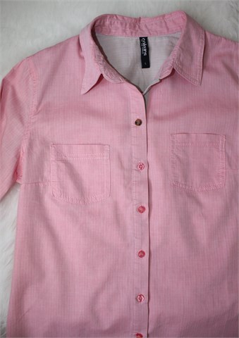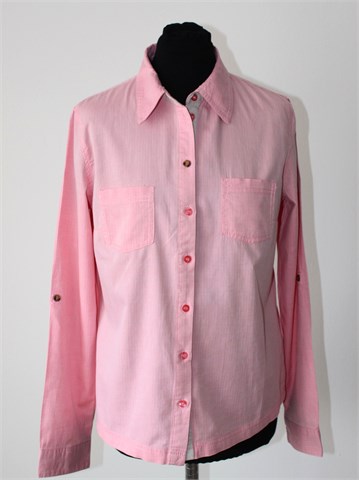 Colours of the world (Takko) košulja sa dugim rukavima (mogu se nositi i kao poludugi - gumbić sa vanjske strane rukava i vezica unutar rukava), roze boje sa uzorkom na materijalu (vidljivo na slikama). Prednje kopčanje, džepići na prsima. Blago strukirana, nije rastezljiva.