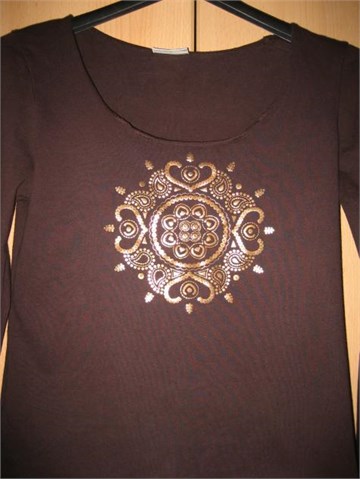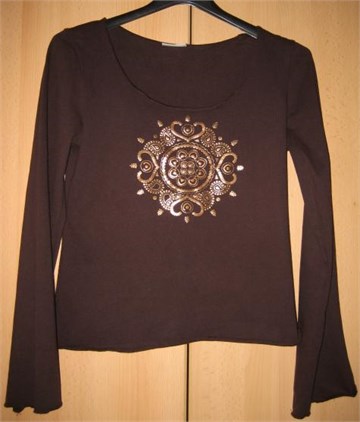 Dugi rukavi, malo se šire pri dnu. Bakreni print. Mekan i rastezljiv pamuk. Obrnuti šavovi na rubovima.