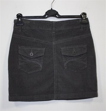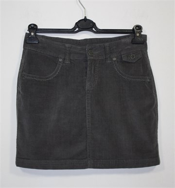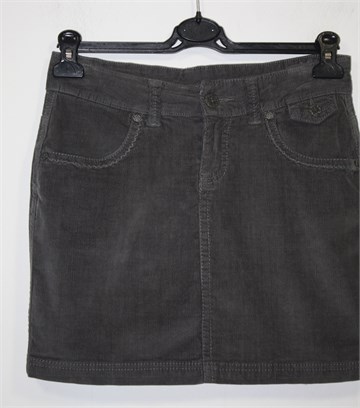 Colours of the World (Takko) kraća suknja od samta, tamnije sive boje. Prednji cif i kopčanje, pasica za remen. Prednji bočni, stražnji džepovi sa preklopom i gumbom. Mekana i rastezljiva, nešto duža sa stražnje strane (vidjeti mjere).