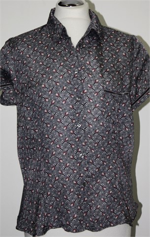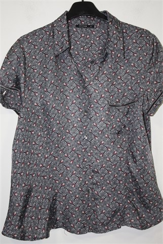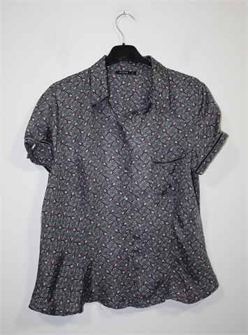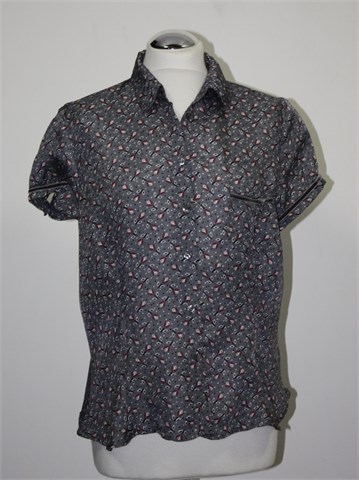 Comma košulja sa kratkim rukavima, sive boje s uzorkom na materijalu (vidljiv na slikama). Prednje kopčanje, mali džepić na prsima. Blago strukirana, ukrasne plišane trakice oko obruba rukava i džepića. Deblja viskoza, na dodir svilenkasta.