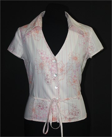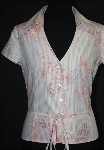 Compagnia Italiana košulja sa kratkim rukavima, bijele boje sa prugama u bojama i cvjetnim printom (isto u boji). Prednje kopčanje sa sedefastim gumbima, ušice za remen sa pripadajućim remenčićem (vezicom). Prednji i stražnji ušitci (strukirana), čvrst i nerastezljiv pamuk.