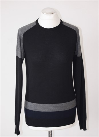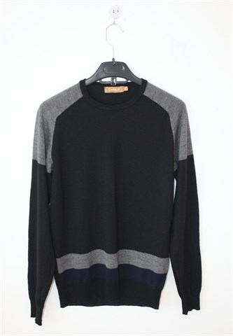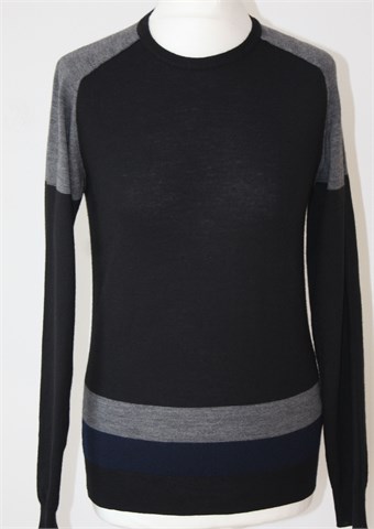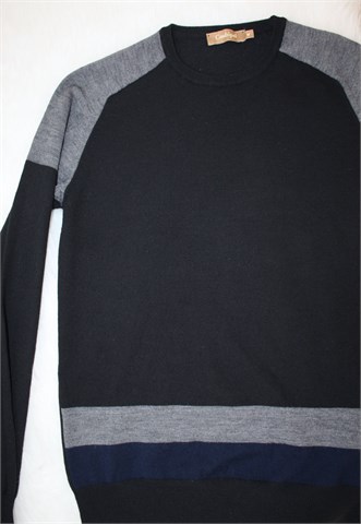 Conbipel vesta/pulover crne boje, detalji u sivoj i plavoj boji (na ramenima i u donjem dijelu prednje strane veste). Tanje pletivo, rastezljivo.