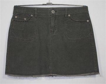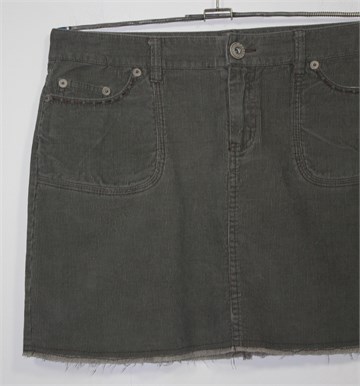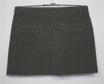 Concept kratka suknja od samta, maslinasto zelene boje. Prednji i stražnji džepovi sa ukrasnim prošivima smeđe boje. Prednji cif i kopčanje, pasica za remen. Cufasti rub ali je porubljena (tvornički).