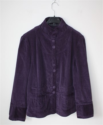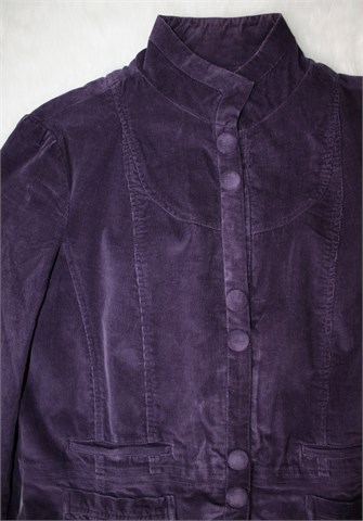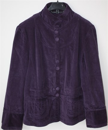 Contempo jakna od samta zagasito ljubičaste boje. Prednje skriveno kopčanje sa drukerima, sa vanjske strane kopčanja su ukrasni gumbi. Prednji džepovi i drukeri na krajevima rukava (po 4 sa svake strane, opet ukrašeni gumbima sa vanjske strane). Sitni samt, mekan i rastezljiv.