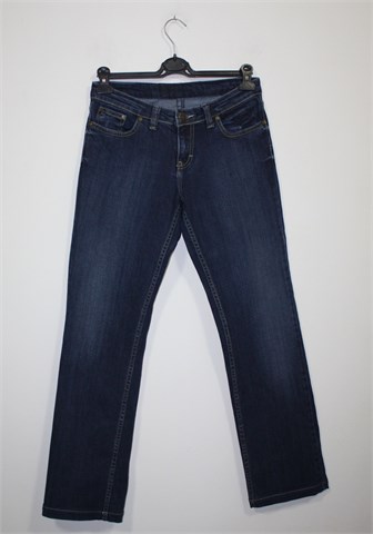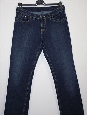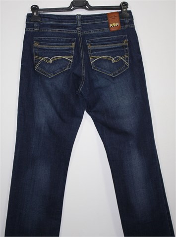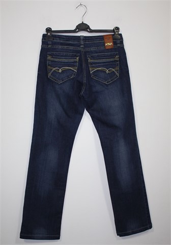 Conto Bene traper hlače, tamnije plave boje mjestimično ispranog izgleda (tvornički used look). Prednji cif i kopčanje, pasica za remen. Prednji i stražnji džepovi. Rastezljive.