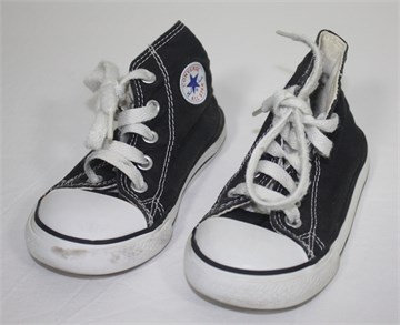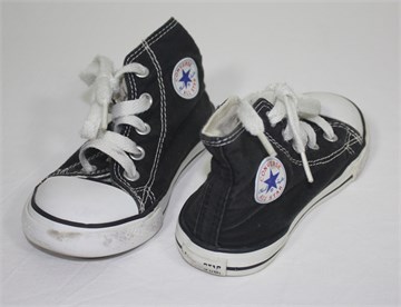 Converse tenisice crne boje, sa gumenom kapicom i bijelim gumenim dijelovima.