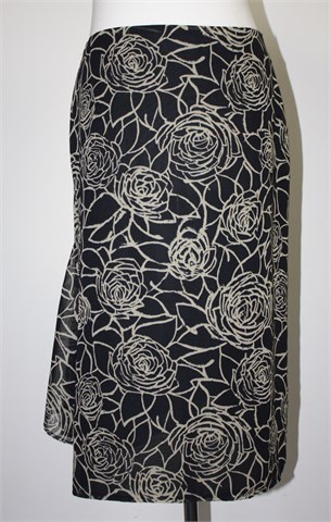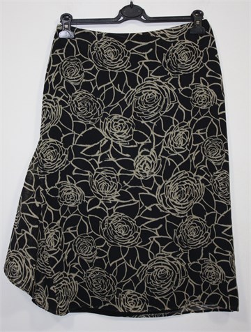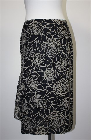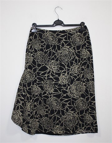 Cortefiel suknja midi dužine, crne boje sa lijepim bež cvjetnim uzorkom. Bočni cif, podstavljena. Sa desne bočne strane je suknja proširena pa super stoji :)