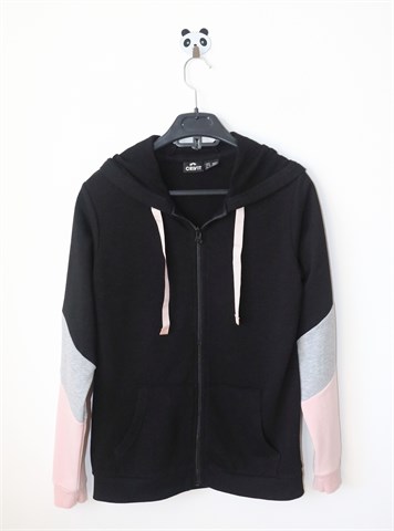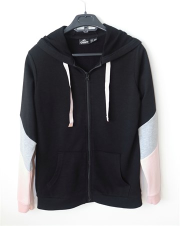 Crivit majica sa cifom i kapuljačom (hoodie), crne boje sa detaljima na rukavima u sivoj i rozoj boji. Prednji džepovi, roza vrpca za zatezanje kapuljače. Rastezljiva.