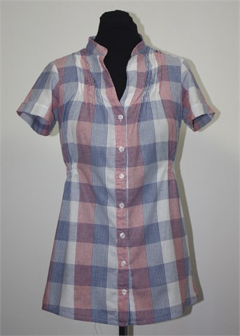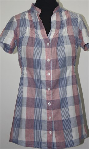 Cubus košulja sa kratkim rukavima, bijele boje sa plavo-crvenim prugasto-kariranim uzorkom. Prednje kopčanje, bočno i sa stražnje strane stegnuta gumicom. Tanji i mekan pamuk, nije rastezljiv.
