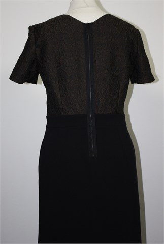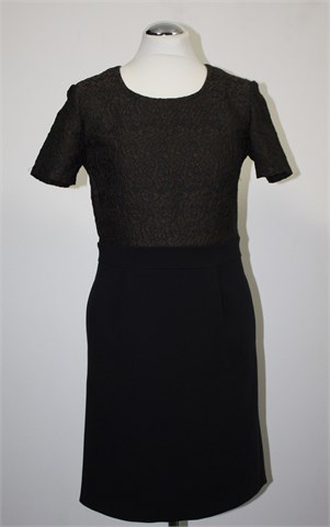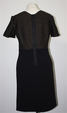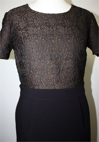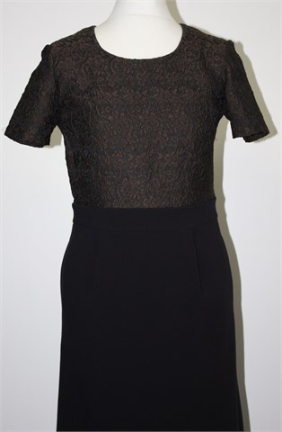 Cyrillus (Paris) haljina sa kratkim rukavima. Gornji dio materijal s uzorkom čipke (čvrsti) smeđe boje, donji dio (suknja) crne boje. Donji dio sa prednje strane ima dva ušitka i bočne džepove. Sa stražnje strane haljine je cif. Gornji materijal nije rastezljiv, donji blago rastezljiv. Podstavljena u donjem dijelu (gornji dio nema podstavu ali nije providan).