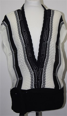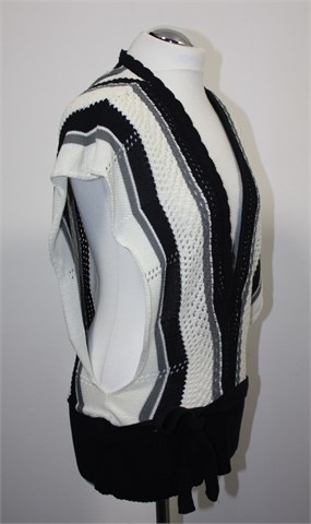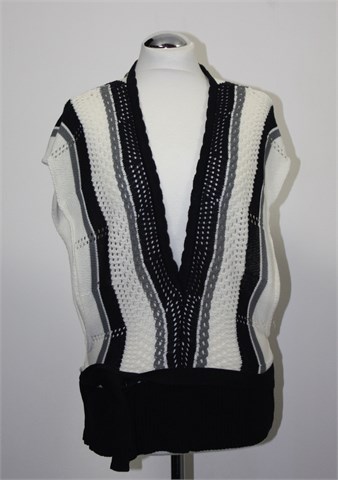 D&M knitwear vesta bez rukava u kombinaciji crne, bijele i sive boje. Pasica je crne boje, bočne vezice za vezanje (sa prednje ili stražnje strane). Bočno otvorena (vidljivo na slici). Mekano, rupičasto i rastezljivo končano pletivo.