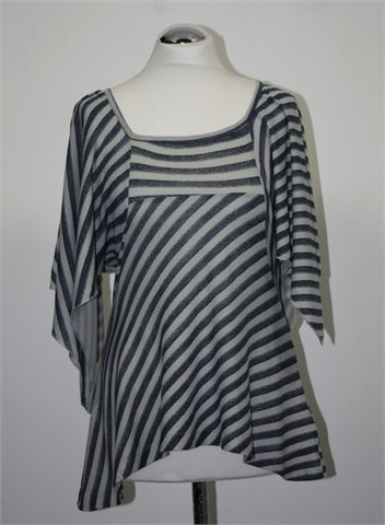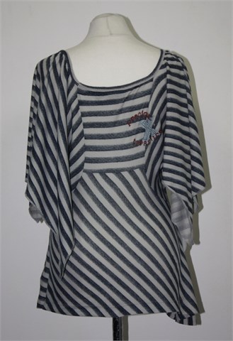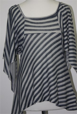 DKNY Jeans majica sive boje sa plavim prugastim uzorkom (kao na slici). Širi otvor rukava (bez šava s unutarnje strane rukavića), asimetrične dužine. Mekana i rastezljiva.