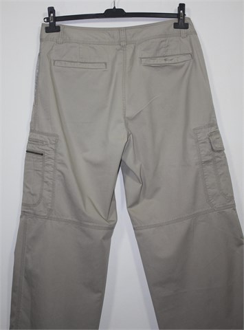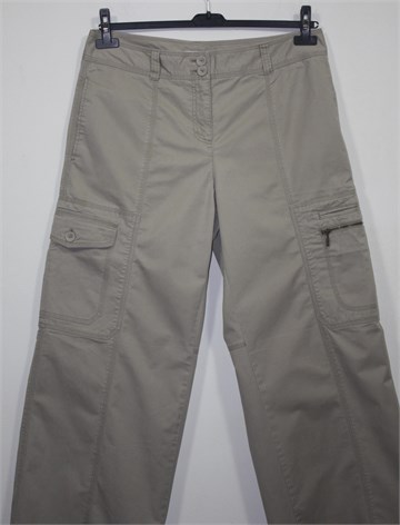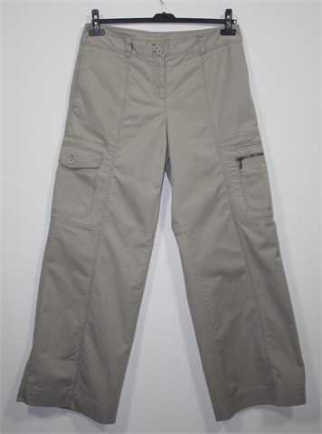 DKNYC (Donna Karan New York City) cargo hlače svijetlo sivo-bež boje. Prednji cif i kopčanje, pasica za remen. Prednji bočni, stražnji skriveni džepovi. Na bedrima džepovi (različiti sa obje strane). Šire nogavice, čvrst i deblji materijal.