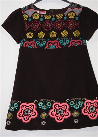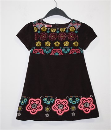 DP AM haljina od samta sa kratkim rukavima, tamno smeđe boje sa šarenim printom i cvjetnim aplikacijama od konca. Stražnji cif, podstavljena pamučnom podstavom. Mekan i tanji samt.
