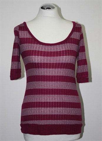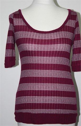Deb tanja pletena rupičasta vestica sa poludugim rukavima, tamnije boje ciklame sa sivim prugama. Mekano, tanko i rastezljivo pletivo.