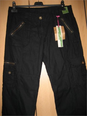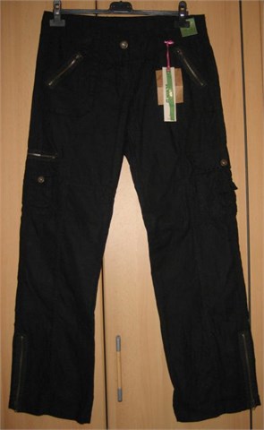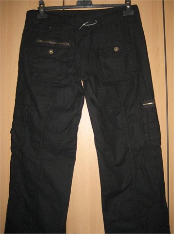 Cargo hlače crne boje. Prednji cif i kopčanje, pasica za remen. Prednji bočni džepovi, stražnji na preklop (na džepovima su ukrasni cifovi i ukrasni crni kamenčići). Na nogavicama džepovi na preklop. Na nogavicama cifovi koji se mogu rastvoriti.