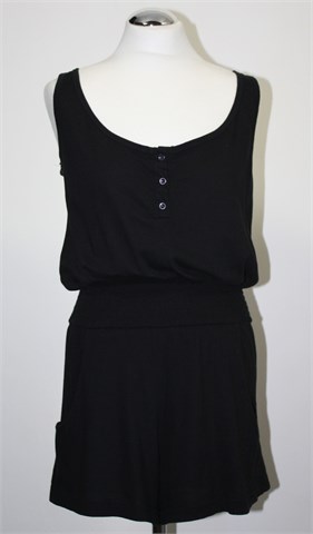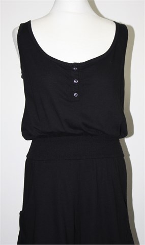 Denim&Co kombinezon bez rukava i sa kratkim nogavicama, crne boje. Sa prednje strane gumbići, stegnuta gumicama u struku. Bočni džepovi. Tanji i rastezljiv materijal.