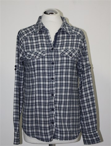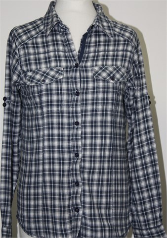 Denim & Co (Primark) košulja sa dugim rukavima, plavo-bijele boje sa prugasto-kariranim uzorkom. Prednje kopčanje, na prsima mali džepići sa preklopom i gumbom. Mekan pamuk, nerastezljiv. Rukavi se mogu nositi i kao kraći (vanjski gumbići i vezica unutar rukava).