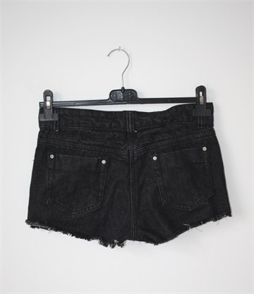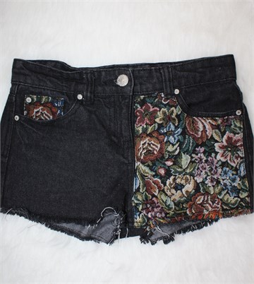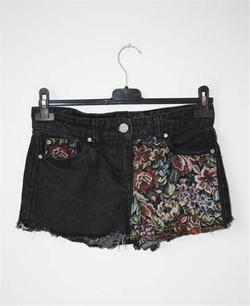 Denim & Co Hot Pant kratke traper hlače tamno sivo-crne boje, sa prednje strane našiven šareni materijal (boje i uzorak na materijalu vidljiv na slikama). Prednji cif i kopčanje, pasica za remen. Prednji i stražnji džepovi, ocufani rubovi nogavica. Nisu rastezljive.