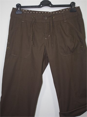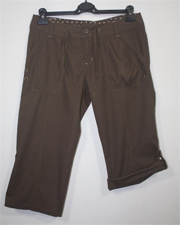 Denim & Co poluduge pamučne hlače, smeđe boje. Prednji cif i kopčanje, pasica za ramen sa provedenom špagicom za vezanje. Prednji duboki džepovi, stražnji klasični. Pomoću vanjskog gumbića i unutrašnje špagice nogavice se mogu još dodatno skratiti. Tanji pamuk.
