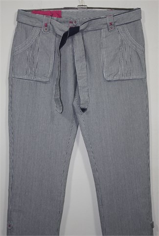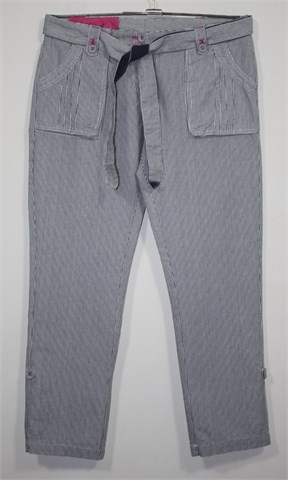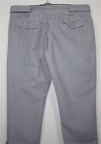 Denim & Co prugaste hlače plavo-bijele boje. Prednji cif i kopčanje, pasica za remen i pripadajući remen od istog materijala. Prednji bočni džepovi (ukrašeni prošivima), stražnji na preklopi i sa gumbom. Detalji od konca ciklama boje.