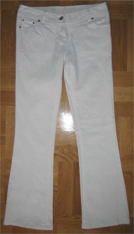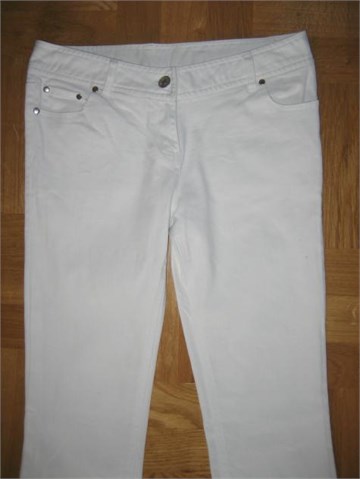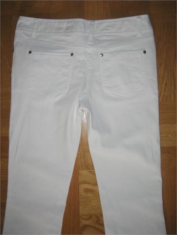 Traper hlače bijele boje, šavovi od bijelog konca. Prednji i stražnji džepovi, pasica za remen. Prednji cif i kopčanje. Rastezljive.