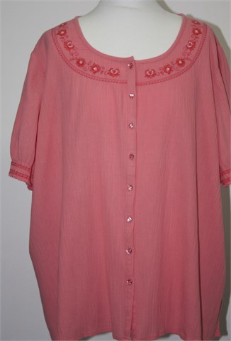 Denim & Company košulja/bluza sa kratkim rukavima, svijetlo rozo-narančaste boje (kao svijetla koraljna boja). Prednje kopčanje, ukrasne končane aplikacije. Rukavići su na krajevima blago stegnuti i proštepani ukrasnim gumicama. Čvrst ali lagan, pomalo gazast pamuk. Blago rastezljiva, mali bočni prorezi.