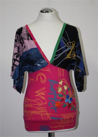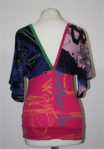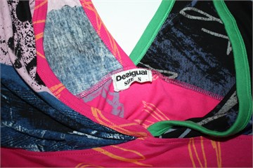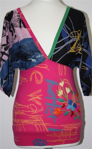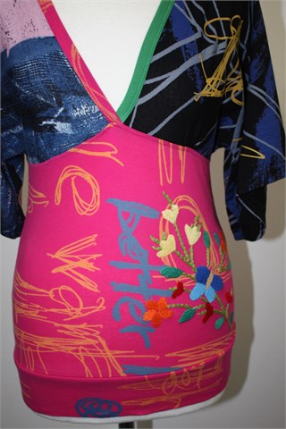 Desigual šarena pamučna majica sa kratkim/poludugim, širokim rukavima (boje i uzorci kao na slici). Sa prednje strane aplikacije od šarenog konca, natpis Desigual preko cijelog lijevog rukava. Mekan i rastezljiv pamuk.