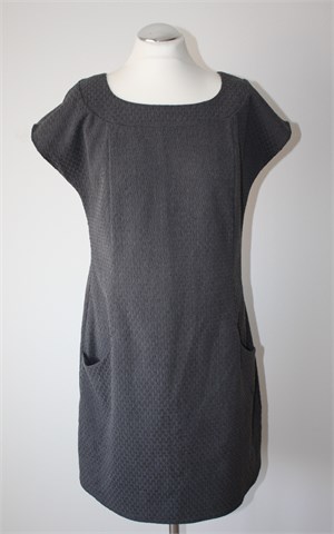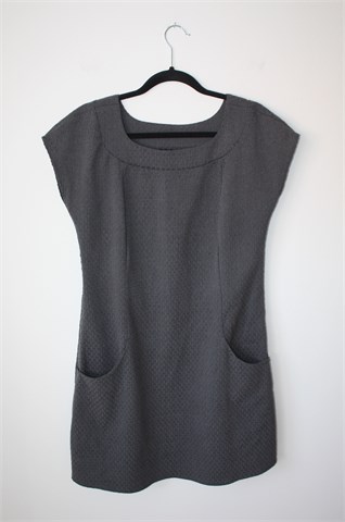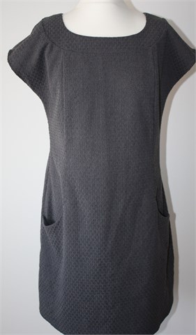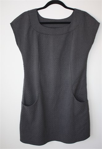 Diadema tunika/haljina sa kratkim rukavima, sive boje sa uzorkom na materijalu (vidljivo na slikama). Prednji bočni džepovi, blago strukirana. Malo rastezljiva, materijal srednje debljine.