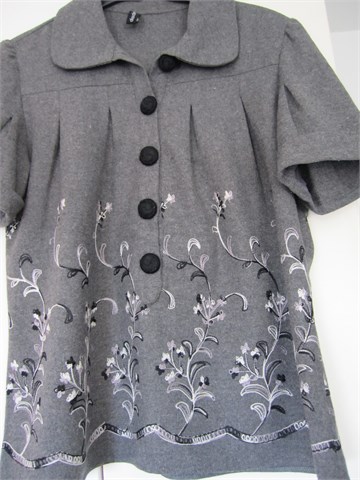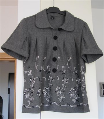 Prekasna zimska tunika (izgleda kao jaknica ali nema kopčanje cijelom dužinom) sive boje sa našivenim končanim aplikacijama. Kratki rukavi sa ušitcima, prednje kopčanje. Zbog visokog postotka vune (50%) vrlo topla, idealna za zimsko slojevito oblaćenje :)
