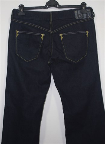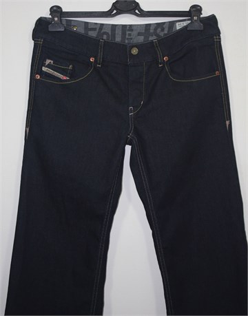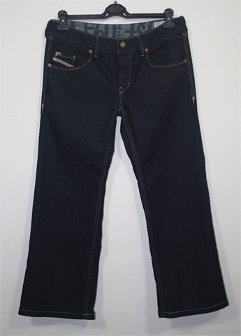 Diesel traper hlače, model Vixy. Tamni traper, prošivene žutim i bež koncem. Prednji drukeri i kopčanje, pasica za remen. Prednji i stražnji klasični džepovi. Rastezljivi traper, šire nogavice.