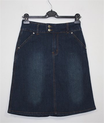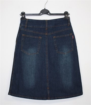 Dihao Jeans wear traper suknja, tamno plave boje mjestimično ispranog izgleda (tvornički used look). Prednji cif i kopčanje, pasica za remen. Prednji i stražnji klasični džepovi. Mali rasporak sa stražnje strane, blago rastezljiva.