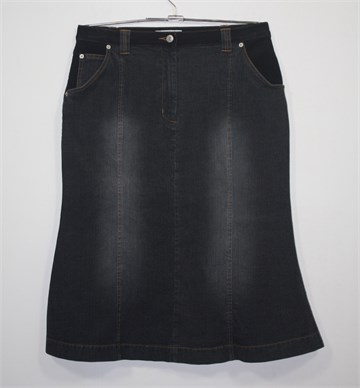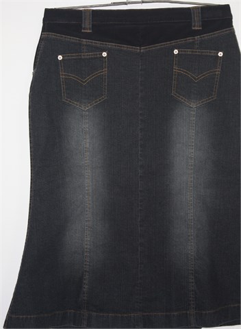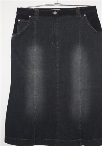 Divino clothing suknja od trapera, tamno sive boje mjestimično ispranog izgleda (tvornički). Pasica i dio oko džepova od crnog samta. Prednje cif i kopčanje, pasica za remen. Prednji i stražnji klasični džepovi. Rastezljiva.