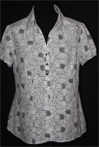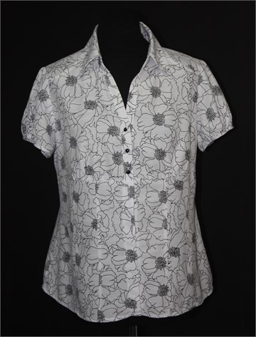 Dressbarn košulja sa kratkim rukavima, bijele boje sa crnim cvjetnim printom. Prednje kopčanje, donji dio gumbi je skriven. Rezana ispod grudi, prednji i stražnji ušitci (blago strukirana). Nije rastezljiva.