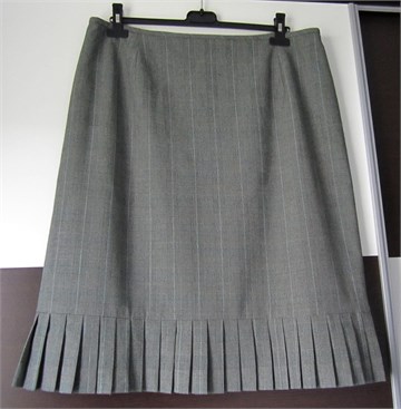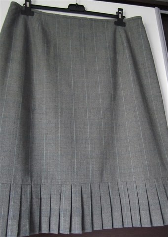 Dressbarn suknja od materijala koji izgleda kao lagani štof, sive boje sa prugastim uzorkom u crno-plavo-bijeloj kombinaciji boja. Suknja ima stražnji cif i kopčicu (jedan dio kopčice se odšio ali se lako zašije novi), podstavljena je. Pri dnu suknje su faldice (sa obje strane).
