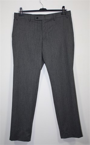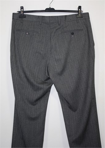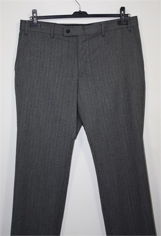 Dressmann tanje vunene hlače lijepog klasičnog kroja, sive boje sa uzorkom. Prednji cif i kopčanje, pasica za remen. Prednji bočni, stražnji skriveni džepovi sa gumbom. Materijal je kao glatki štof. Podstavljene sa prednje strane (do cca pola dužine).