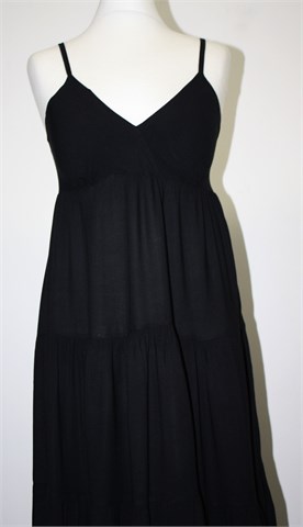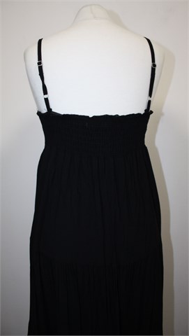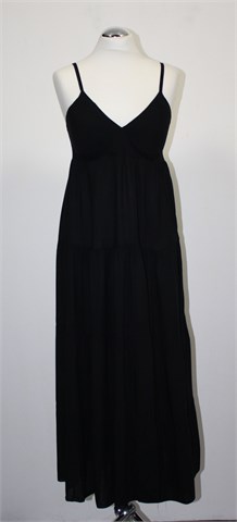 Dugačka haljina crne boje sa tankim, podesivim naramenicama. Spužvasto podstavljene košarice (ne mora se nositi grudnjak), lagan i prozračan pamuk (djeluje kao viskoza). Sa stražnje gornje strane prošivena gumicama pa je širina vrlo prilagodljiva (vidjeti mjere), šira u donjem dijelu.