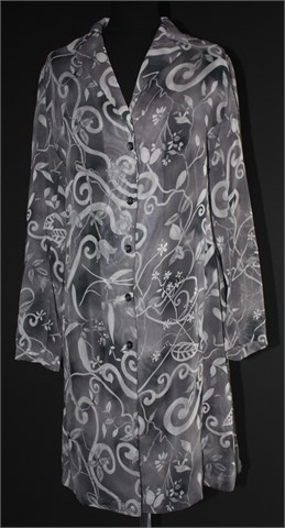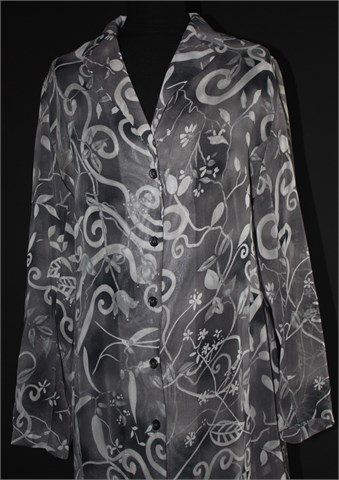 Dugačka poluprozirna košulja/tunika sa dugim rukavima, sive boje sa svjetlijim cvjetnim uzorkom. Prednje kopčanje, rasporak sa stražnje strane. Lagana i lepršava.