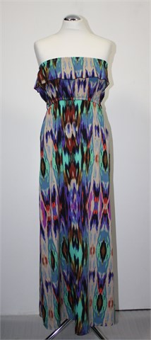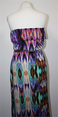 Dugačka/maxi haljina sa šarenim uzorkom (boje i uzorci kao na slikama). Bez naramenica, Iznad i ispod prsiju je ušivena gumica pa je širina dosta prilagodljiva (i haljina ne klizi). Uz gornji šav ušiven je volančić (sa obje strane), bočne ušice za remen (bez remena). Lagan, na dodir svilenkast materijal (vjerojatno poliester).