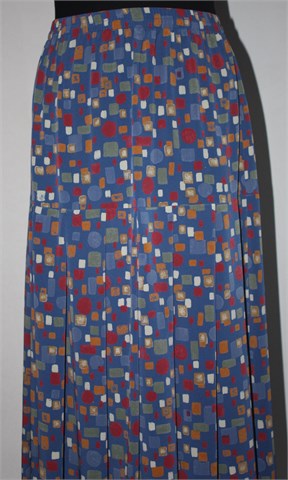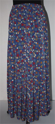 Dugačka suknja plave boje sa šarenim uzorkom. Materijal je lagan, svilenkast na dodir i lepršav (nema etiketu). Gumica u struku, rezana u bokovima i prema dolje se blago širi.