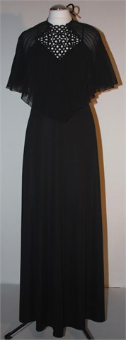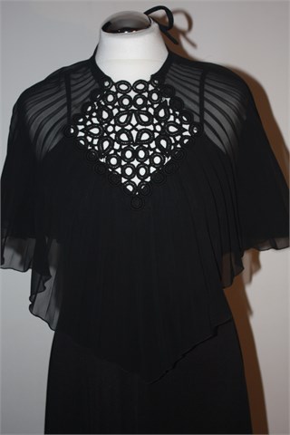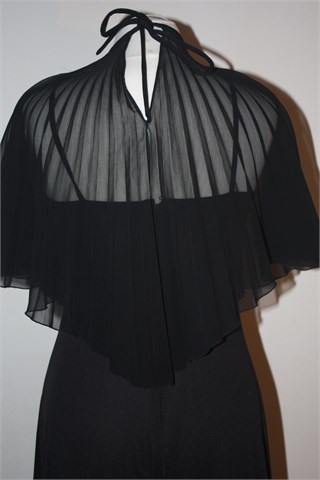 Dugačka svečana haljina crne boje, sa heklanim detaljima na dekolteu i plisiranim materijalom preko cijelog gornjeg dijela. Vezanje oko vrata, leđa su pokrivena (ali materijal je proziran). Haljina ima cif i tanke fiksne naramenice.