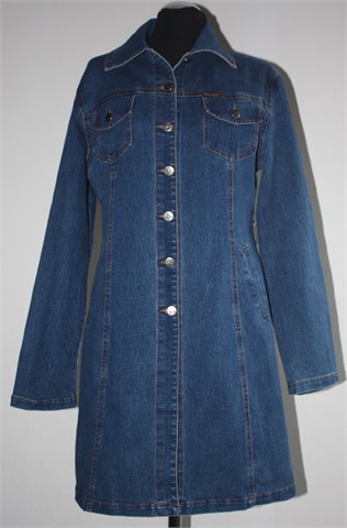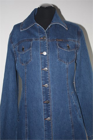 Duža jakna od trapera, sa prednjim kopčanjem na gumbe. Bočni džepovi i džepići na prsima. Ima ušice za remen ali nema remena (može se staviti bilo kakav uži remen). Blago rastezljiva.