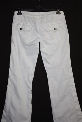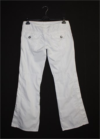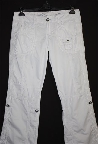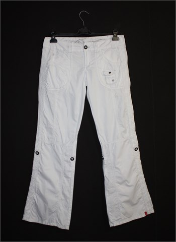 EDC by Esprit cargo/casual hlače bijele boje, prošivene sivim koncem. Prednji cif i kopčanje, pasica za remen. Prednji, stražnji i džepovi na nogavicama. Mogu se nositi i kao poluduge hlače (gumbići sa vanjske strane i vezice s unutarnje strane nogavica). Tanje i lagane.