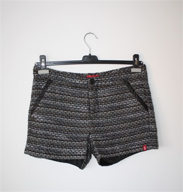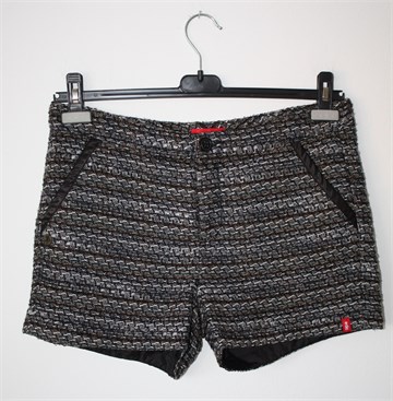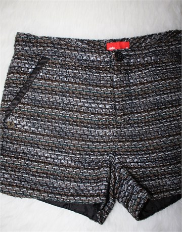 EDC by Esprit zimske kratke hlače od štofa/tvida. Prošarani prugasti uzorak (isprepletene niti), prevladavaju crna, siva, smeđa, bijela, zelena boja - mjestimično su niti šljokave (vidljivo na slikama). Prednji cif i kopčanje, cijele podstavljene. Prednji bočni, stražnji skriveni džepovi (rub džepova ukrašen crnim satenskim materijalom). Nisu rastezljive.