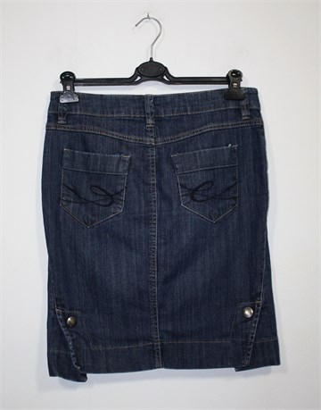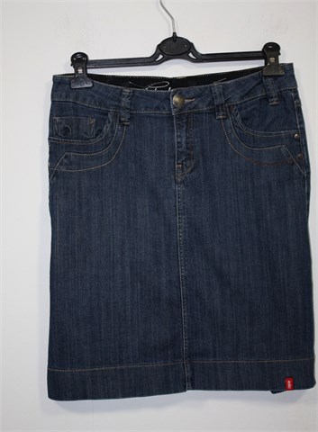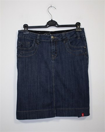 EDC by Esprit traper suknja, srednje plave boje. Prednji cif i kopčanje, pasica za remen. Prednji bočni, stražnji klasični džepovi. Sa stražnje strane mali bočni rasporci sa drukerima (vidljivo na slici). Blago rastezljiva, lijepo se formira po tijelu.