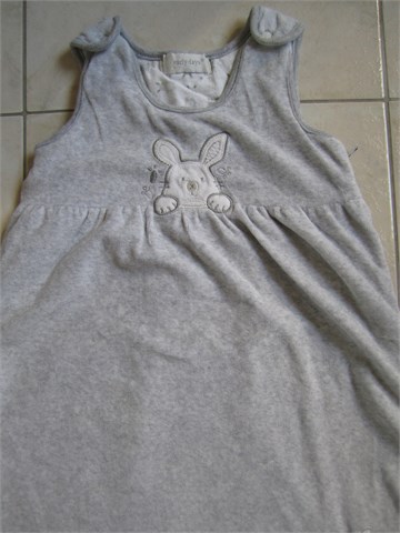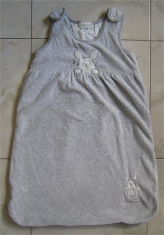 Early Days vreća sa spavanje od frotira, svijetlo sive boje s aplikacijama. Kopčanje na drukere na naramenicama, zatvaranje/otvaranje pomoću cifa.