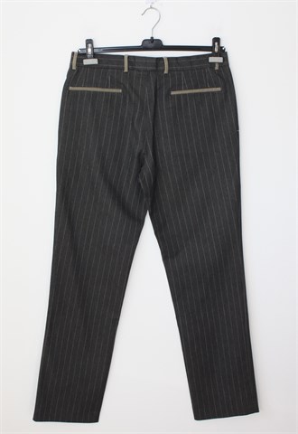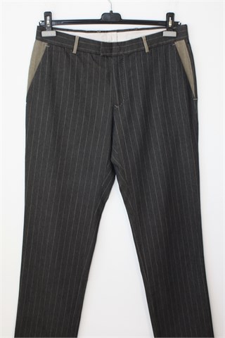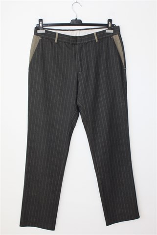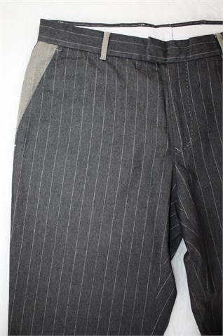 Egon Furstenberg hlače (od materijala koji izgleda kao lagani traper) sivo-plave boje sa svijetlim prugama. Prednji cif i kopčanje, pasica za remen. Prednji bočni, stražnji skriveni džepovi. Lagan i čvrst materijal, blago rastezljiv.